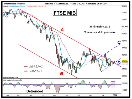 Nel grafico, infatti, è identificabile un possibile trend rialzista (delimitato dalle rette C e D) il quale potrebbe favorire un rimbalzo, peraltro già iniziato dal 25 novembre (inizio della retta D).