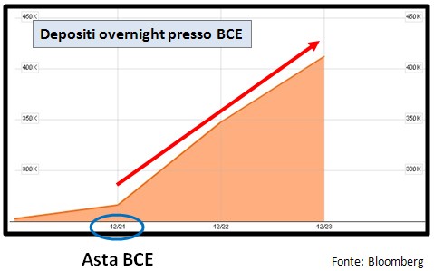 Venerdì, invece, in possesso dei dati aggiornati al 22 dicembre si diceva: "Ed ora scopriamo che di questi 210 miliardi per il momento 82 sono stati depositati presso la stessa BCE.".